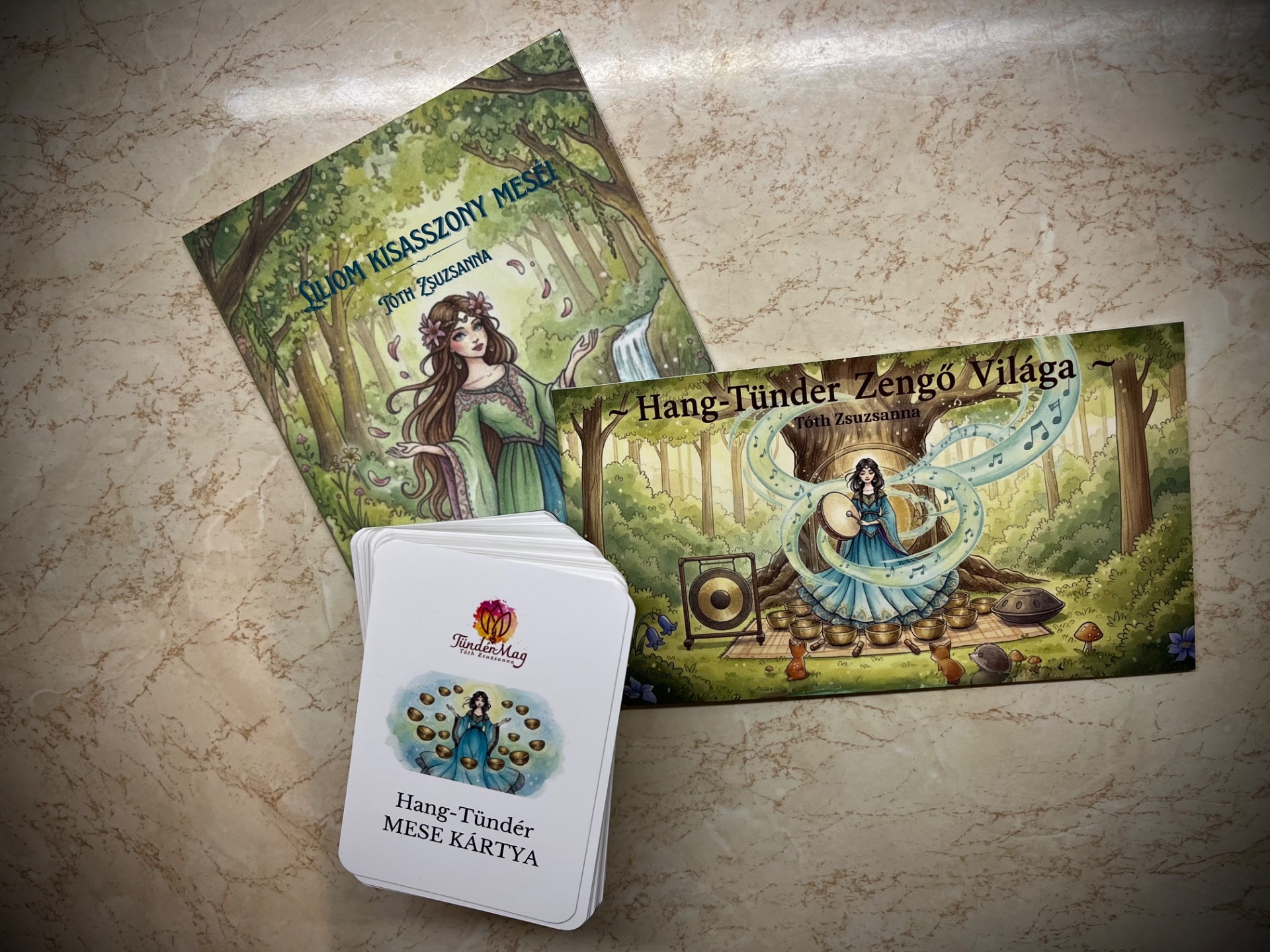 A Hang-Tündér Mese kártyák egy 73 lapból álló különleges kártyacsomag, amely a magyar ősi hitvilág, a népmesék szimbolikus világa, a Hang-Tündér hangterápiás hangszerei, valamint Liliom kisasszony mesebeli szereplői és Nagy-Magyarország helyszínei köré szövődik.